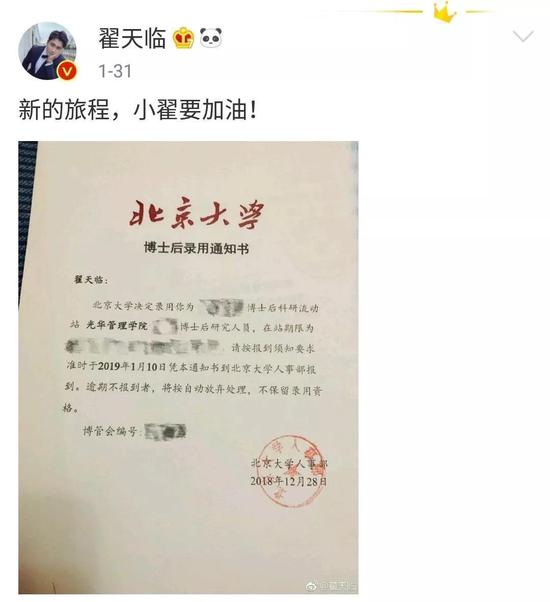随后,翟天临发表致歉信,称“虚荣心和侥幸心让我迷失了自己”,还宣布将正式申请退出北京大学博士后科研流动站的相关工作。